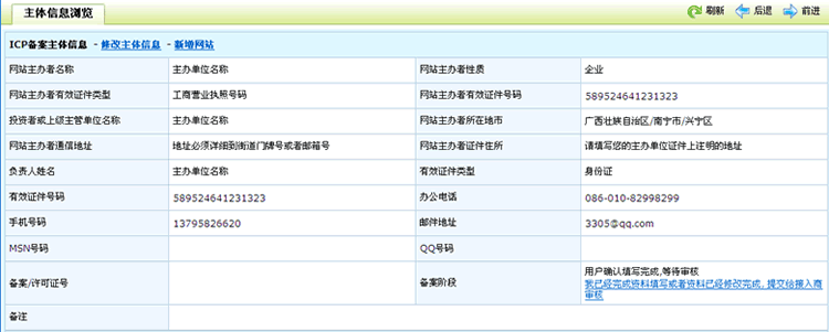 可以查看已经提交的备案的网站所有者信息、新增网站等。现在备案阶段是, 用户确认填写完成,等待审核